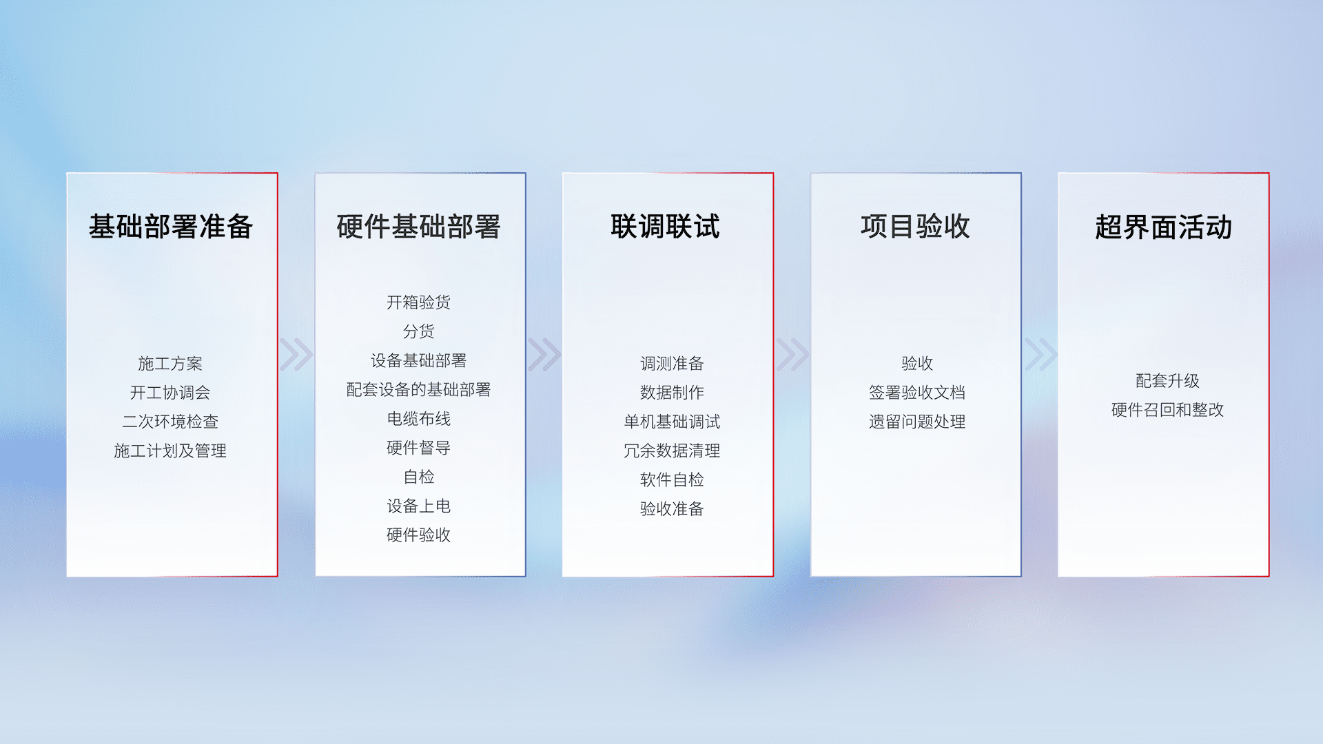从基础部署准备、、、、硬件基础部署、、、、联调联试、、、项目验收、、、越界面活动的全过程可追溯,,,保证施工质量和进度。。。。
